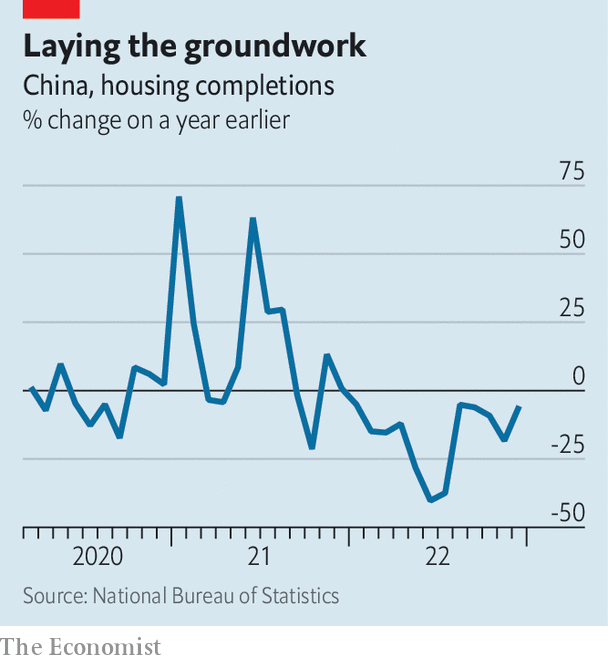 The plan is showing some early results. Home completions fell by 6% year on year in December, marking a recovery from the month before when they fell by 18% (see chart). This is a closely watched measure: unfinished homes prompted homebuyers to boycott their mortgage payments last year, as part of a wave of protests. The reforms have been assisted by the removal of covid-19 restrictions. A few weeks before the policy changes, moving about in Chinese cities (say, to look at a property) carried the threat of quarantine. Preliminary data from Beike Research Institute, a consultancy, suggest that sales of existing homes in 50 big Chinese cities may have risen by more than a fifth in the first ten days of the year, compared with the same period a month earlier.