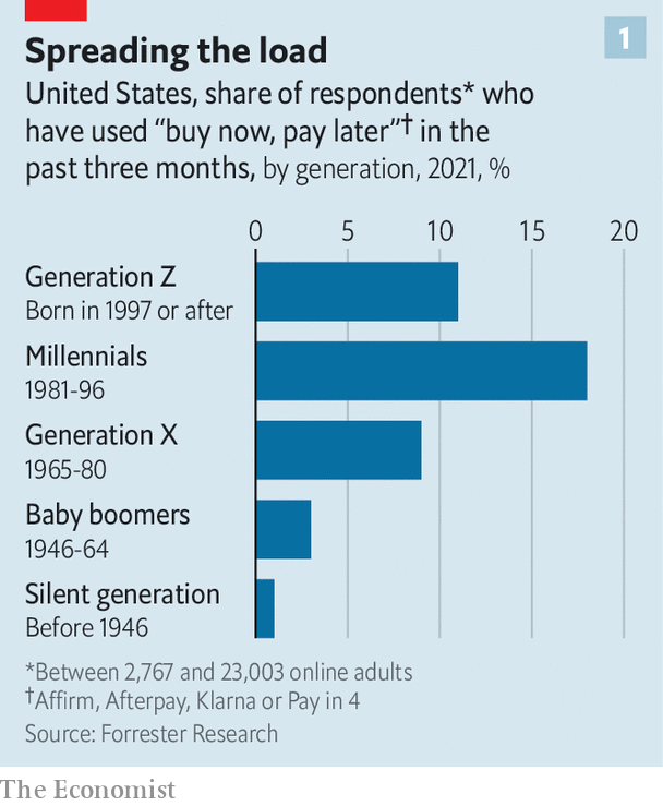 Easy access to means of spreading payments may encourage splashing out (see chart 1). According to another survey by McKinsey in October, 45% of Europeans in their teens and early 20s planned some kind of splurge in the next three months whereas 83% of Boomers, born before 1964, said “No” to such profligacy. Forrester, a market-research firm, found that most users of “buy now, pay later” apps are around 20. Megan Scott, a 20-year-old student from London, speaks for many of her peers by admitting that, when shopping, she has no restraint—until, she chuckles, the bill arrives.