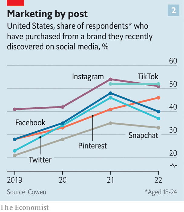 The internet has also changed how the young discover brands (see chart 2). Print, billboard or TV advertising has given way to social media. Instagram, part of Meta’s empire, and TikTok, a Chinese-owned video-sharing app, are where the young look for inspiration, particularly for goods where looks matter such as fashion, beauty and sportswear. TikTok’s user-generated videos can propel even tiny brands to speedy viral fame. Such apps are increasingly adding features that allow users to shop without ever leaving the platform. According to McKinsey, by 2021 six in ten Americans under the age of 25 had completed a purchase on a social-media site. Some are following the Chinese model of “social commerce” by mixing live-streamed entertainment with the chance shop.